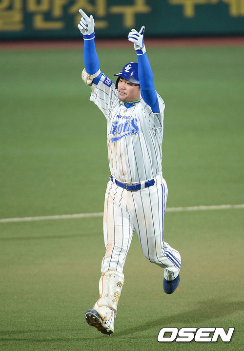 31일 오후 대구구장에서 열리는 '2013 한국야쿠르트 세븐 프로야구' 한국시리즈 6차전 삼성 라이온즈와 두산 베어스의 경기, 7회말 2사 1,2루 삼성 박한이가 두산 니퍼트를 상대로 스리런 홈런을 때린 뒤 베이스를 돌고 있다.