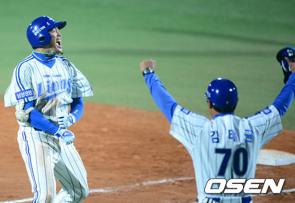 31일 오후 대구구장에서 열리는 '2013 한국야쿠르트 세븐 프로야구' 한국시리즈 6차전 삼성 라이온즈와 두산 베어스의 경기 7회말 2사 1,2루 삼성 박한이가 3점 홈런을 날린후 환호하고 있다