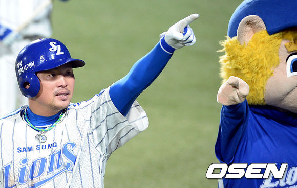 31일 오후 대구구장에서 열리는 '2013 한국야쿠르트 세븐 프로야구' 한국시리즈 6차전 삼성 라이온즈와 두산 베어스의 경기, 7회말 2사 1,2루 삼성 박한이가 두산 니퍼트를 상대로 스리런 홈런을 때린 뒤 세레머니를 하고 있다.