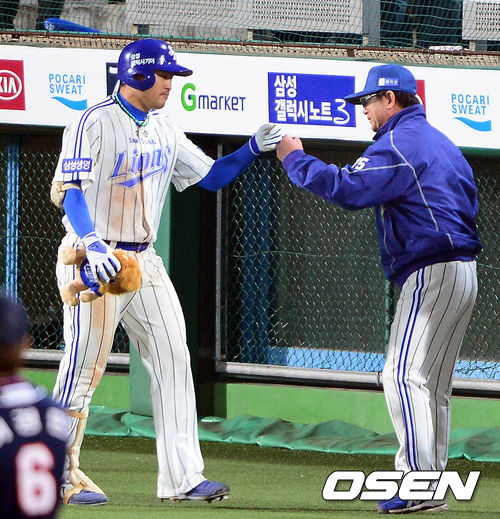 31일 오후 대구구장에서 열린 '2013 한국야쿠르트 세븐 프로야구' 한국시리즈 6차전 삼성 라이온즈와 두산 베어스의 경기 7회말 2사 1,2루 박한이가 스리런포를 치고 류중일 감독과 하이파이브를 하고 있다.
