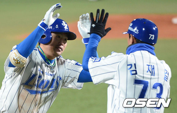 31일 오후 대구구장에서 열리는 '2013 한국야쿠르트 세븐 프로야구' 한국시리즈 6차전 삼성 라이온즈와 두산 베어스의 경기, 7회말 2사 1,2루 삼성 박한이가 두산 니퍼트를 상대로 스리런 홈런을 때린 뒤 3루 김재걸 코치와 하이파이브를 하고 있다.