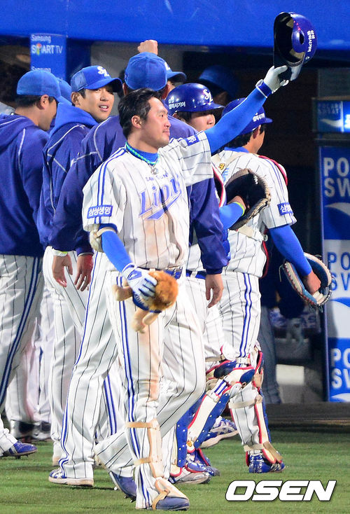 31일 오후 대구구장에서 열린 '2013 한국야쿠르트 세븐 프로야구' 한국시리즈 6차전 삼성 라이온즈와 두산 베어스의 경기 7회말 2사 1,2루 박한이가 스리런포를 치고 관중들에게 인사를 하고 있다.