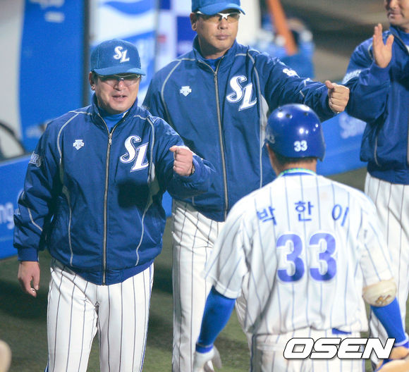 31일 오후 대구구장에서 열리는 '2013 한국야쿠르트 세븐 프로야구' 한국시리즈 6차전 삼성 라이온즈와 두산 베어스의 경기 7회말 2사 1,2루 삼성 박한이가 3점 홈런을 날린후 류중일 감독의 축하를 받고 있다