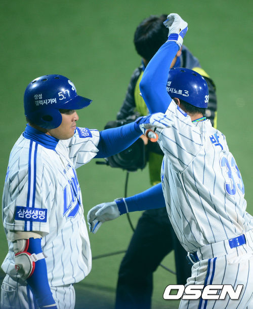 31일 오후 대구구장에서 열리는 '2013 한국야쿠르트 세븐 프로야구' 한국시리즈 6차전 삼성 라이온즈와 두산 베어스의 경기 7회말 2사 1,2루 삼성 박한이가 3점 홈런을 날린후 동료들의 축하를 받고 있다