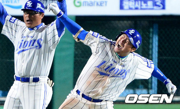 31일 오후 대구구장에서 열린 '2013 한국야쿠르트 세븐 프로야구' 한국시리즈 6차전 삼성 라이온즈와 두산 베어스의 경기 7회말 2사 1,2루 박한이가 스리런포를 치고 환호하고 있다.