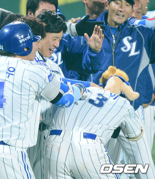 31일 오후 대구구장에서 열리는 '2013 한국야쿠르트 세븐 프로야구' 한국시리즈 6차전 삼성 라이온즈와 두산 베어스의 경기 7회말 2사 1,2루 삼성 박한이가 3점 홈런을 날린후 동료들의 축하를 받고 있다