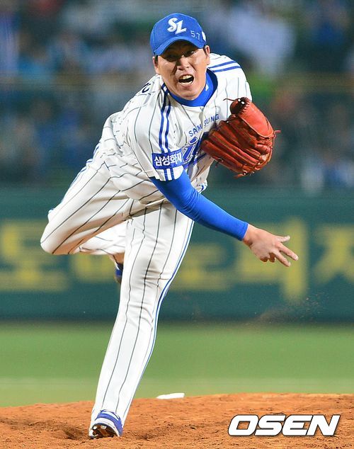 31일 오후 대구구장에서 열린 '2013 한국야쿠르트 세븐 프로야구' 한국시리즈 6차전 삼성 라이온즈와 두산 베어스의 경기, 9회초 두산 공격 때 삼성 투수 신용운이 힘차게 공을 뿌리고 있다.