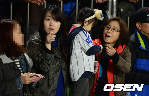 31일 오후 대구구장에서 열리는 '2013 한국야쿠르트 세븐 프로야구' 한국시리즈 6차전 삼성 라이온즈와 두산 베어스의 경기 삼성 박한이 아내 조명진이 카메라를 향해 손짓하고 있다.
