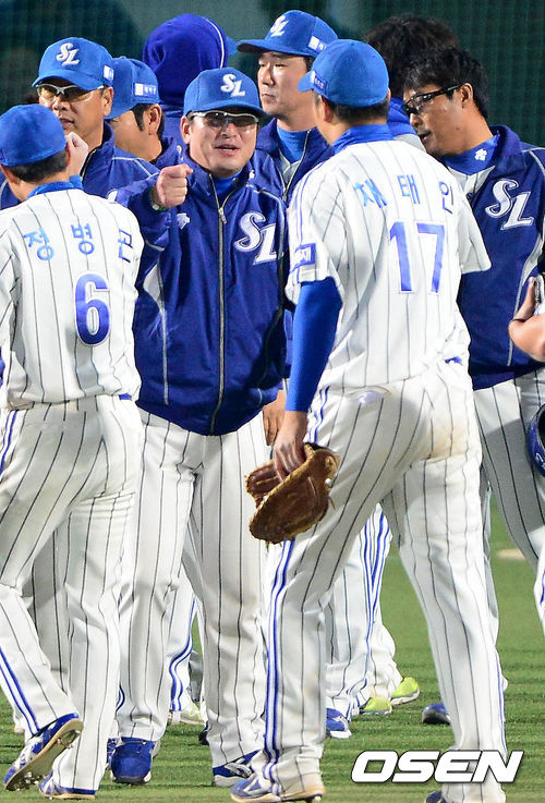 31일 오후 대구구장에서 열린 '2013 한국야쿠르트 세븐 프로야구' 한국시리즈 6차전 삼성 라이온즈와 두산 베어스의 경기 종료 후 류중일 감독과 채태인이 하이파이브를 하고 있다.