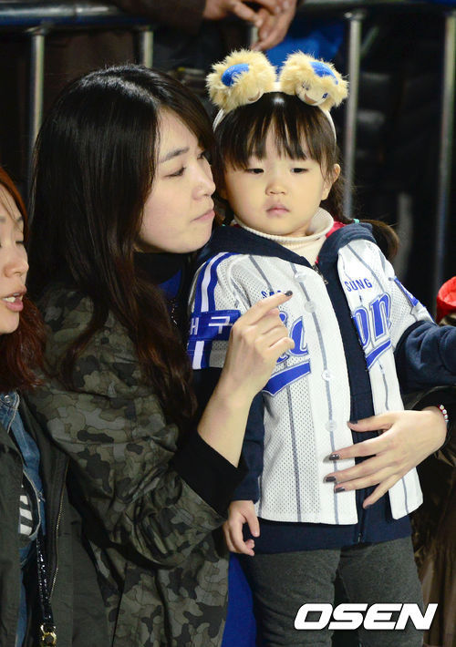 삼성 라이온즈 외야수 박한이의 아내 조명진과 딸 수영 양은 지난달 31일 오후 대구구장에서 열린 '2013 한국야쿠르트 세븐 프로야구' 한국시리즈 6차전 삼성 라이온즈와 두산 베어스의 경기에서 관중석에 앉은 모습이 포착됐다.