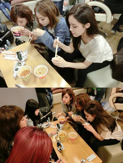 1일 티아라의 소속사가 공개한 사진에는 음악방송 대기실에서 컵라면과 김밥으로 끼니를 때우고 있는 티아라의 모습이 담겨 있다.