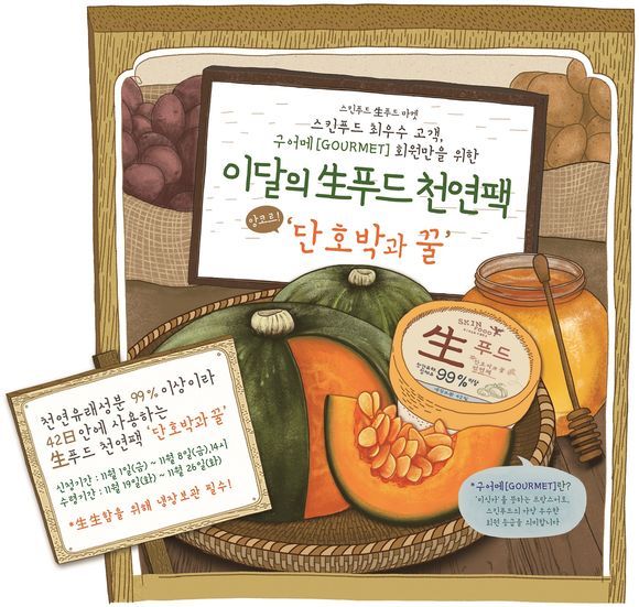 생(生)푸드 천연팩 ‘단호박과 꿀’은 천연 단호박과 꿀 성분 등 천연유래 성분과 정제수를 99% 이상 함유한 제품이다. 부기에 효과가 좋은 비타민A와 수분손실을 막아 노화를 억제하는 카로테노이드가 풍부한 단호박을 잘게 갈아 보습에 탁월한 식물성 버터와 꿀을 혼합하여 만들어졌다.