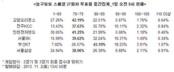 국내 프로농구(KBL) 3경기 대상 농구토토 스페셜 27회차 투표율 중간집계