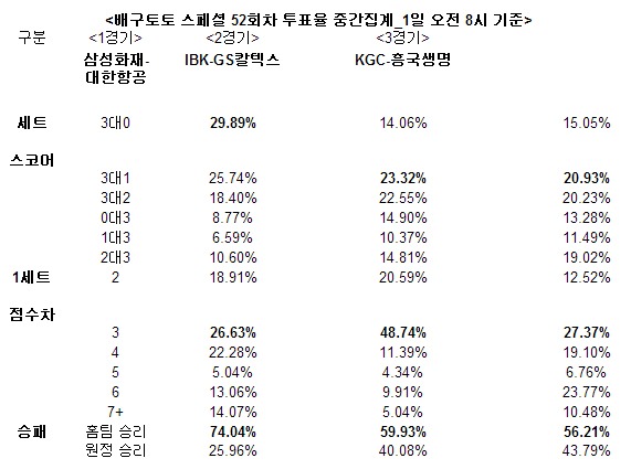2013-2014시즌 프로배구 대상 배구토토 스페셜 52회차 중간집계 결과