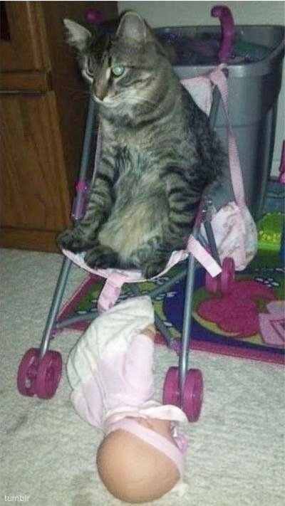 공개된 '아기 인형과 싸운 고양이' 사진 속에는 고양이가 유모차에 앉아 있고 바닥에는 아기 인형이 누워 있다. 이 사진만 놓고 보면 고양이가 유모차에 앉으려고 아기 인형을 떨어뜨리고 그 자리에 들어간 것처럼 보여 웃음을 자아낸다.