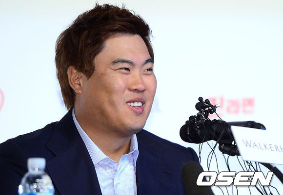 류현진이 질문에 답변하고 있다.