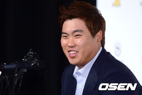 류현진이 질문에 답변하고 있다.