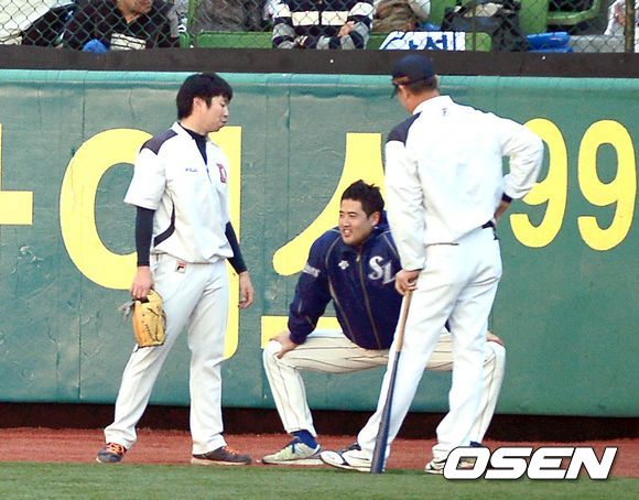 1일 오후 대구구장에서 열리는 '2013 한국야쿠르트 세븐 프로야구' 한국시리즈 7차전 삼성 라이온즈와 두산 베어스의 경기에 앞서 가벼운 러닝으로 몸울 풀던 장원삼이 두산 정명원 코치와 이야기를 나누고 있다.
