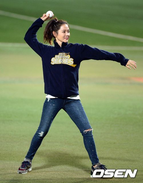 1일 오후 대구구장에서 열리는 '2013 한국야쿠르트 세븐 프로야구' 한국시리즈 7차전 삼성 라이온즈와 두산 베어스의 경기에 앞서 손예진이 멋진 폼으로 시구를 하고 있다.