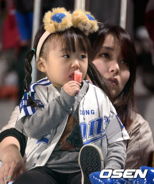 1일 오후 대구구장에서 열리는 '2013 한국야쿠르트 세븐 프로야구' 한국시리즈 7차전 삼성 라이온즈와 두산 베어스의 경기, 삼성 박한이의 아내 조명진씨와 딸 박수영양이 경기장을 찾았다.