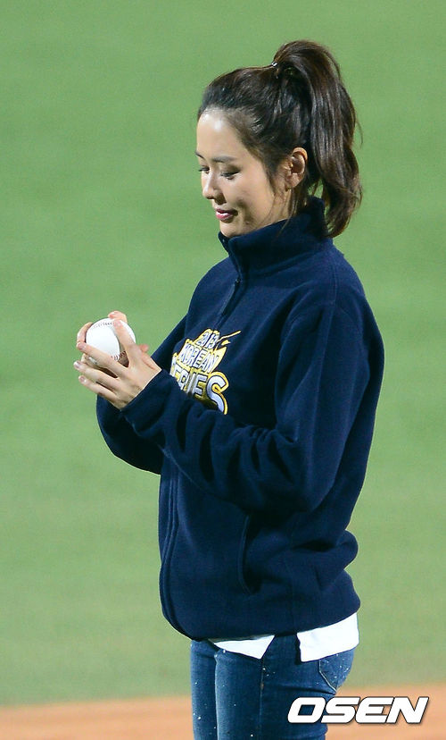 1일 오후 대구구장에서 열린 '2013 한국야쿠르트 세븐 프로야구' 한국시리즈 7차전 삼성 라이온즈와 두산 베어스의 경기에 앞서 배우 손예진이 시구를 하고 있다