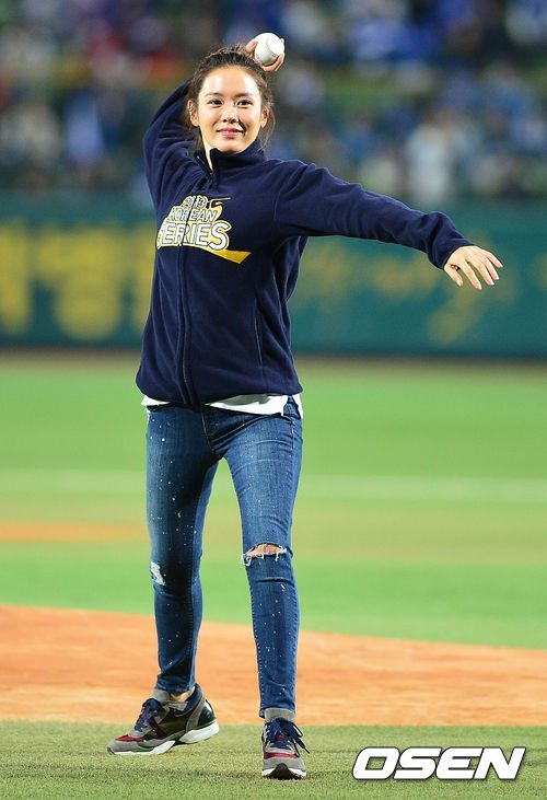1일 오후 대구구장에서 열린 '2013 한국야쿠르트 세븐 프로야구' 한국시리즈 7차전 삼성 라이온즈와 두산 베어스의 경기에 앞서 배우 손예진이 시구를 하고 있다.