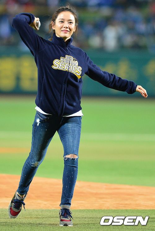 1일 오후 대구구장에서 열린 '2013 한국야쿠르트 세븐 프로야구' 한국시리즈 7차전 삼성 라이온즈와 두산 베어스의 경기에 앞서 배우 손예진이 시구를 하고 있다.