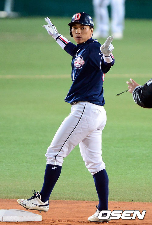 1일 오후 대구구장에서 열린 '2013 한국야쿠르트 세븐 프로야구' 한국시리즈 7차전 삼성 라이온즈와 두산 베어스의 경기 1회초 선두타자 이종욱이 우익수 오른쪽 2루타를 치고 2루 베이스에 서 있다.