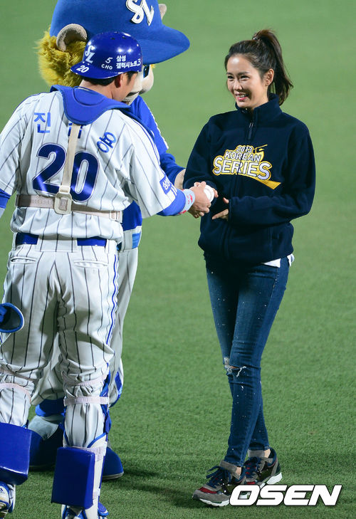 1일 오후 대구구장에서 열린 '2013 한국야쿠르트 세븐 프로야구' 한국시리즈 7차전 삼성 라이온즈와 두산 베어스의 경기에 앞서 배우 손예진이 시구를 마친후 삼성 진갑용 포수와 악수를 나누고 있다.