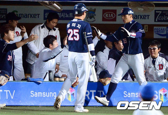 1일 오후 대구구장에서 열린 '2013 한국야쿠르트 세븐 프로야구' 한국시리즈 7차전 삼성 라이온즈와 두산 베어스의 경기 1회초 1사 3루 김현수의 1타점 적시타에 홈을 밟은 이종욱이 덕아웃에서 동료들과 하이파이브를 하고 있다.
