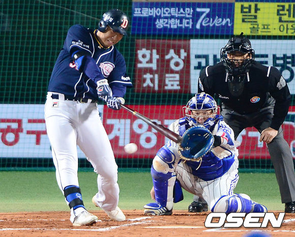 1일 오후 대구구장에서 열린 '2013 한국야쿠르트 세븐 프로야구' 한국시리즈 7차전 삼성 라이온즈와 두산 베어스의 경기 1회초 1사 3루 김현수가 1타점 적시타를 치고 있다.