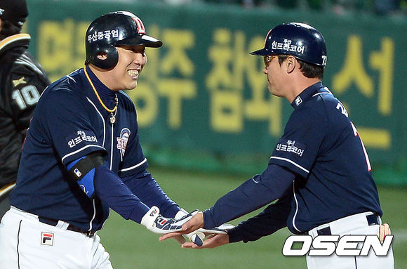 1일 오후 대구구장에서 열리는 '2013 한국야쿠르트 세븐 프로야구' 한국시리즈 7차전 삼성 라이온즈와 두산 베어스의 경기, 1회초 1사 3루 두산 김현수가 1타점 적시타를 때린 뒤 1루 김민재 코치와 기뻐하고 있다.