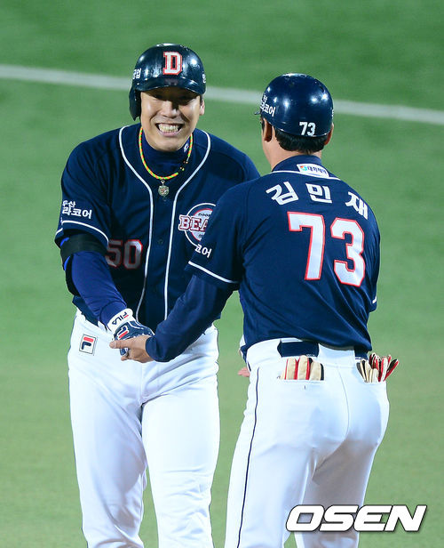1일 오후 대구구장에서 열린 '2013 한국야쿠르트 세븐 프로야구' 한국시리즈 7차전 삼성 라이온즈와 두산 베어스의 경기, 1회초 1사 3루에서 두산 김현수가 선제 1타점 우전 적시타를 날리고 기뻐하고 있다.