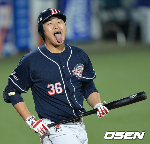 1일 오후 대구구장에서 열리는 '2013 한국야쿠르트 세븐 프로야구' 한국시리즈 7차전 삼성 라이온즈와 두산 베어스의 경기, 1회초 2사 1,2루 오재일 헛 스윙을 하며 귀여운 표정을 짓고 있다.