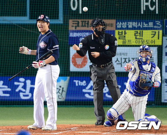 1일 오후 대구구장에서 열린 '2013 한국야쿠르트 세븐 프로야구' 한국시리즈 7차전 삼성 라이온즈와 두산 베어스의 경기 1회초 2사 1,2루 오재일이 헛스윙을 하고 미소를 짓고 있다.