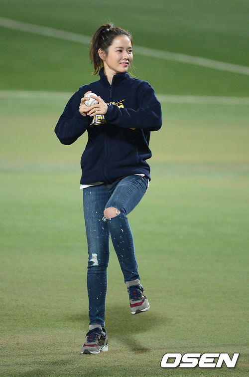 1일 오후 대구구장에서 열리는 '2013 한국야쿠르트 세븐 프로야구' 한국시리즈 7차전 삼성 라이온즈와 두산 베어스의 경기에 앞서 배우 손예진이 글러브 없이 맨손으로 시구를 하고 있다.