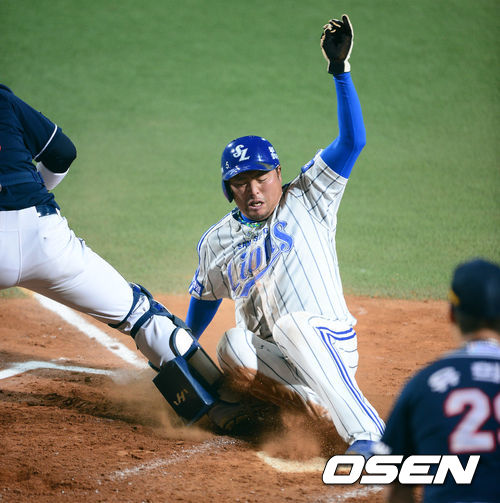 1일 오후 대구구장에서 열린 '2013 한국야쿠르트 세븐 프로야구' 한국시리즈 7차전 삼성 라이온즈와 두산 베어스의 경기, 1회말 1사 1,3루에서 삼성 박한이가 박석민의 좌익수 플라이에 태그업, 홈에서 슬라이딩하며 세이프되고 있다.