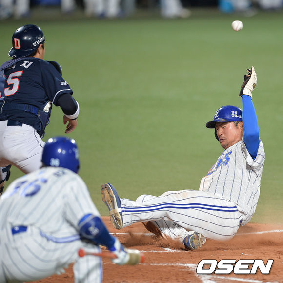 1일 오후 대구구장에서 열리는 '2013 한국야쿠르트 세븐 프로야구' 한국시리즈 7차전 삼성 라이온즈와 두산 베어스의 경기, 1회말 1사 만루 박선민 희생플라이때 3루 주자 박한이 태그업 동점 득점을 올리고 있다.