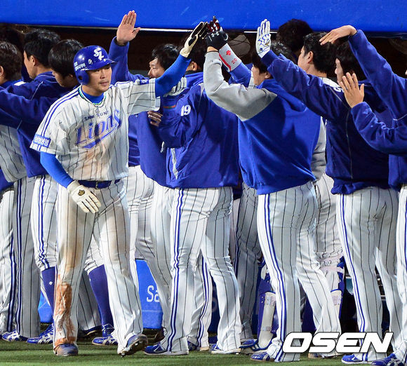 1일 오후 대구구장에서 열린 '2013 한국야쿠르트 세븐 프로야구' 한국시리즈 7차전 삼성 라이온즈와 두산 베어스의 경기 1회말 1사 만루 박석민의 희생플라이에 홈인한 박한이가 덕아웃에서 동료들과 하이파이브를 하고 있다.