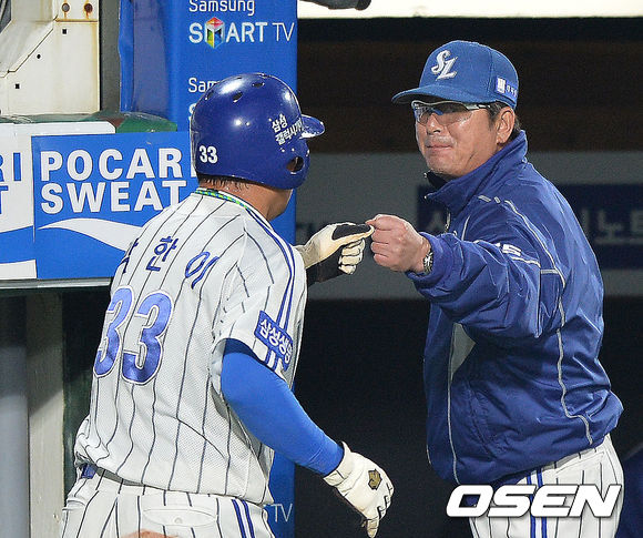 1일 오후 대구구장에서 열리는 '2013 한국야쿠르트 세븐 프로야구' 한국시리즈 7차전 삼성 라이온즈와 두산 베어스의 경기, 1회말 1사 만루 박석진의 희생플라이때 3루 주자 박한이 동점 득점을 올리며 류중일 감독의 환영을 받고 있다.