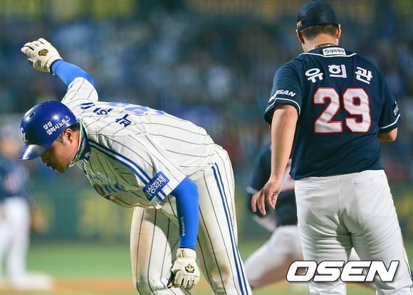 1일 오후 대구구장에서 열린 '2013 한국야쿠르트 세븐 프로야구' 한국시리즈 7차전 삼성 라이온즈와 두산 베어스의 경기, 1회말 삼성 공격 1사 만루 상황 박석민의 동점 1타점 좌익수 희생플라이 때 득점에 성공한 박한이가 더그아웃으로 향하고 있다.
