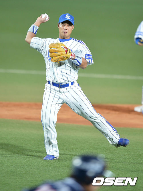 1일 오후 대구구장에서 열리는 '2013 한국야쿠르트 세븐 프로야구' 한국시리즈 7차전 삼성 라이온즈와 두산 베어스의 경기, 2회초 1사 삼성 김태원 2루수가 정수빈의 안타때 수비를 펼치고 있다.