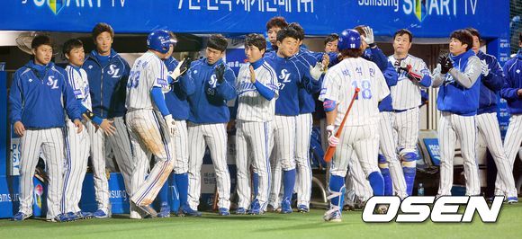 1일 오후 대구구장에서 열린 '2013 한국야쿠르트 세븐 프로야구' 한국시리즈 7차전 삼성 라이온즈와 두산 베어스의 경기, 1회말 삼성 공격 1사 만루 상황 박석민의 1타점 동점 희생플라이 때 득점에 성공한 박한이가 더그아웃 동료들과 인사를 나누고 있다.