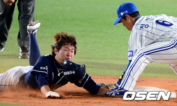 1일 오후 대구구장에서 열린 '2013 한국야쿠르트 세븐 프로야구' 한국시리즈 7차전 삼성 라이온즈와 두산 베어스의 경기 2회초 2사 1루 이종욱 타석 1루주자 정수빈이 도루에 실패하고 있다.