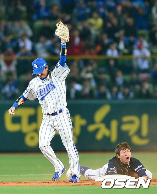 1일 오후 대구구장에서 열린 '2013 한국야쿠르트 세븐 프로야구' 한국시리즈 7차전 삼성 라이온즈와 두산 베어스의 경기, 2회초 두산 공격 2사 1루 상황 이종욱 타석 때 주자 정수빈이 2루 도루를 시도하다 삼성 유격수 정병곤의 태그에 걸려 아웃된 뒤 아쉬워하고 있다.