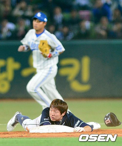 1일 오후 대구구장에서 열린 '2013 한국야쿠르트 세븐 프로야구' 한국시리즈 7차전 삼성 라이온즈와 두산 베어스의 경기, 2회초 두산 공격 2사 1루 상황 이종욱 타석 때 주자 정수빈이 2루 도루를 시도하다 삼성 유격수 정병곤의 태그에 걸려 아웃된 뒤 아쉬워하고 있다.