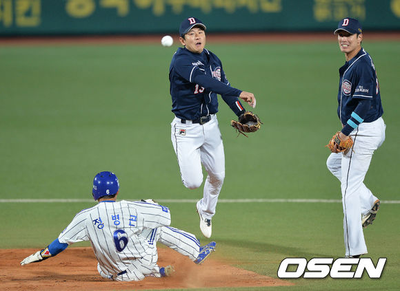 1일 오후 대구구장에서 열리는 '2013 한국야쿠르트 세븐 프로야구' 한국시리즈 7차전 삼성 라이온즈와 두산 베어스의 경기, 2회말 1사 1,2루 배영섭의 내야땅볼때 손시헌 유격수가 1루주자 정병곤을 2루에서 포스아웃 시키며 1루에 송구 병살아웃 처리하고 있다.
