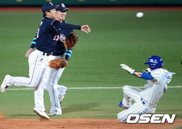 1일 오후 대구구장에서 열리는 '2013 한국야쿠르트 세븐 프로야구' 한국시리즈 7차전 삼성 라이온즈와 두산 베어스의 경기, 2회말 1사 1,2루 삼성 배영섭의 2루수 앞 땅볼때 손시헌이 1루 정병곤을 포스아웃으로 잡아낸 뒤 1루로 송구하고 있다.
