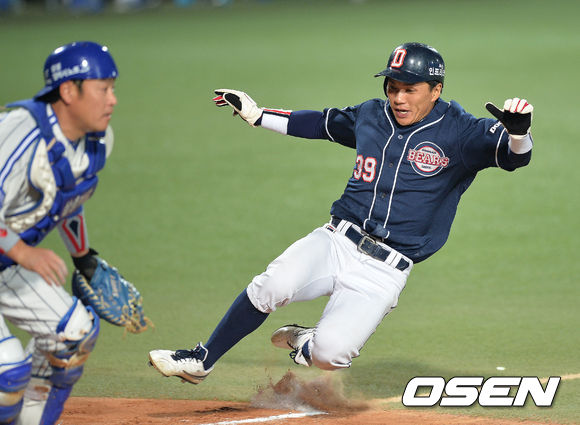 1일 오후 대구구장에서 열리는 '2013 한국야쿠르트 세븐 프로야구' 한국시리즈 7차전 삼성 라이온즈와 두산 베어스의 경기, 3회초 1사 만루 양의지 희생플라이때 3루주자 이종욱 태그업 득점을 올리고 있다.