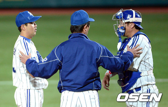 1일 오후 대구구장에서 열리는 '2013 한국야쿠르트 세븐 프로야구' 한국시리즈 7차전 삼성 라이온즈와 두산 베어스의 경기, 3회초 1사 1,2루 삼성 김태한 코치가 마운드에 올라 이야기를 나누고 있다.